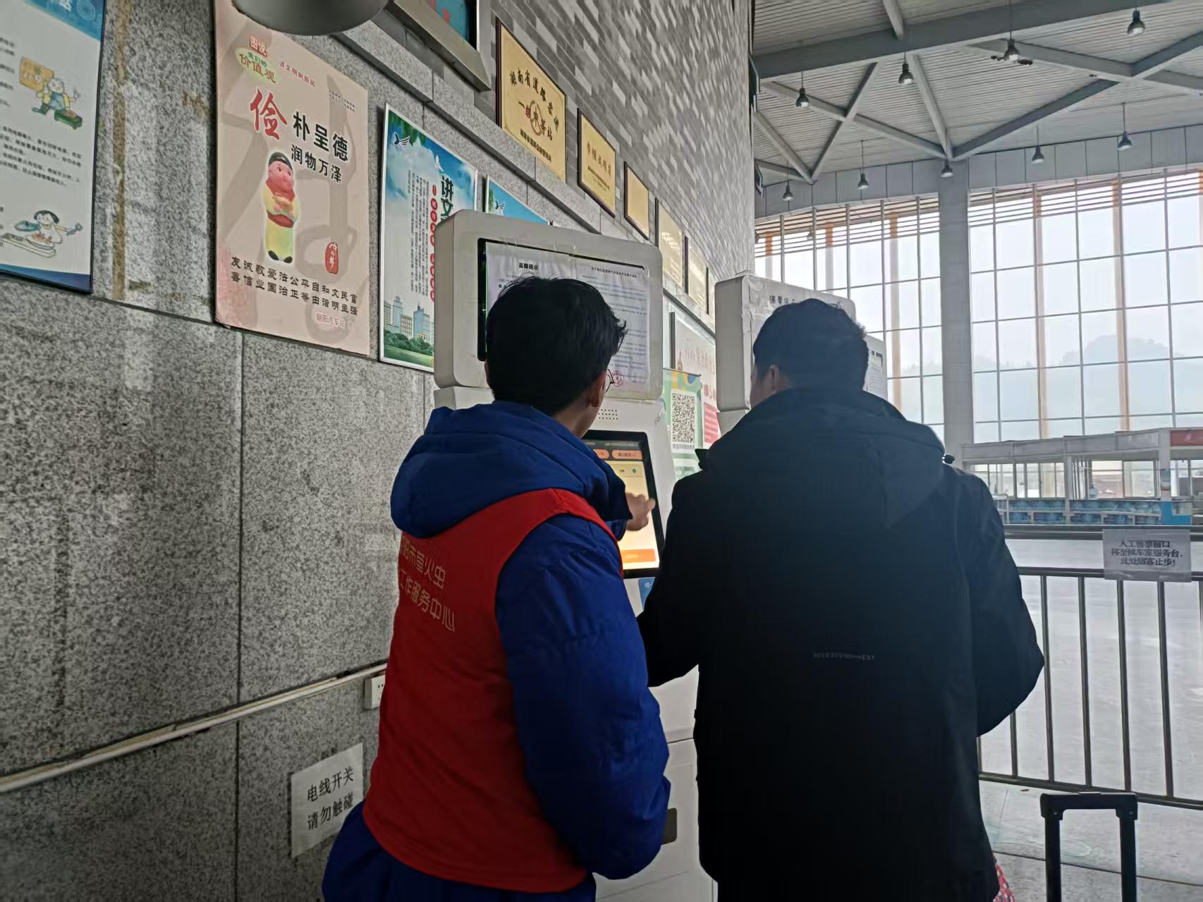 2月13日9:00,朝陽汽車站進站處一個身穿紅馬甲的“工作人員”正在自助售票機前指導旅客買票。這是外事旅游運輸分公司聯(lián)合益陽螢火蟲社會工作服務中心在春運期間開展的“暖冬行動 情滿旅途”春運志愿服務。
